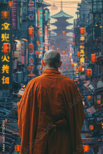 © grey, Naklejka premium A rear view of a monk walking at a busy street