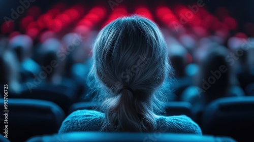 Obraz premium A rear view of a person sitting in an audience watching a show, with the...