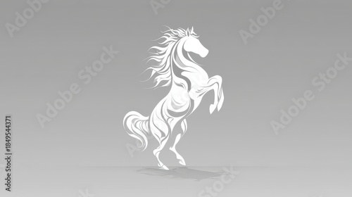© Ell, Fototapeta premium A rearing white horse silhouette with flowing mane and tail, against a soft gray backdrop. It is stylized, showing motion