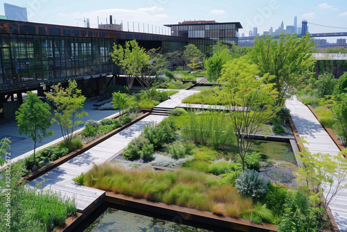 Fototapeta premium A reclaimed industrial area transformed into a green park, blending modern landscape design with nature