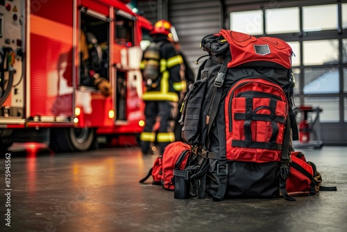 Obraz premium A red and black backpack is laying on the floor next to a fire truck...