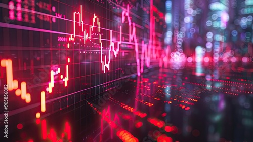 © Dusit, Fototapeta premium A red and black graph with a red line that is going down. The graph is on a screen in a city