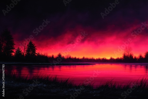 © Ilona, Obraz premium A red and black sunset over a body of water