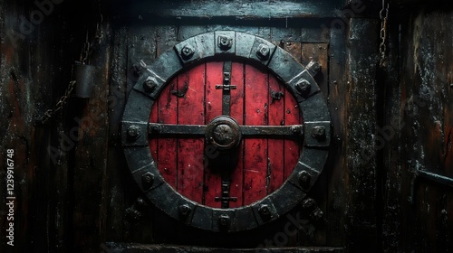 © Linus, Fototapeta premium A red and black wooden circle with a cross on it