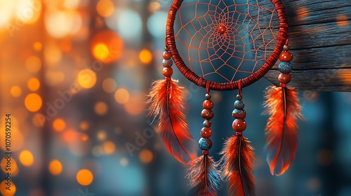 © Santi, Naklejka premium A red and brown dreamcatcher with feathers and beads hanging from a wooden post against a blurred background of warm golden lights.