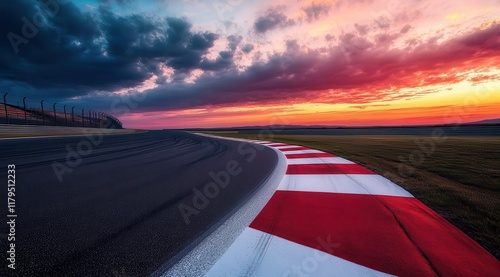 © Bambalino Studio, Naklejka premium A red and white striped road with a sunset in the background. The road is empty and the sky is cloudy