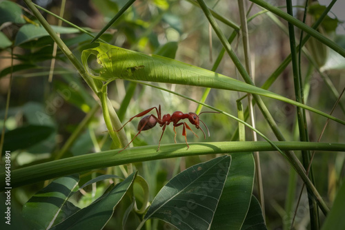 © Riyad, Fototapeta premium A red ant carries a large green leaf, showcasing the strength and determination of nature's tiny workers.