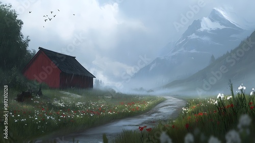 © Hakimul Islam Sorol, Fototapeta premium A red barn sits in a field of wildflowers next to a misty mountain range mountains