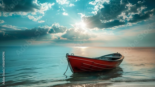 Fototapeta premium A red boat rests on the calm shore under a beautiful sky with sun rays...