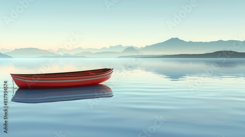 Naklejka premium A red boat sits in the middle of a calm lake