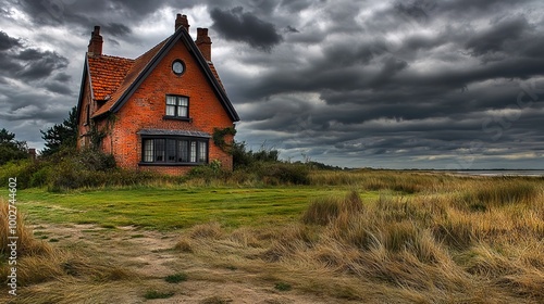 © VISUAL BACKGROUND, Fototapeta premium A red brick house sitting in the middle of a grassy field