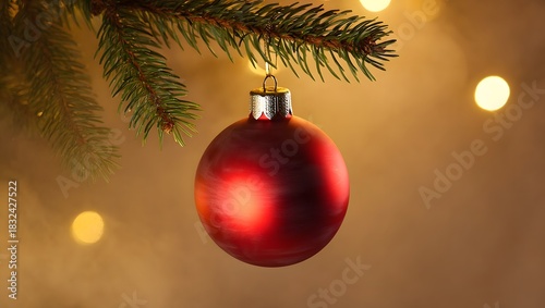 Obraz premium A red Christmas ornament hanging from a pine branch with soft holiday lights...