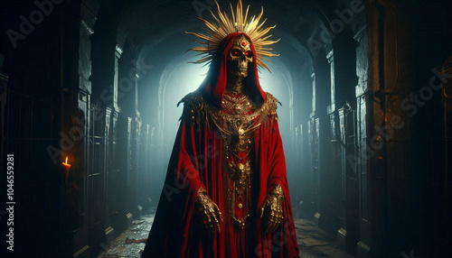 Fototapeta premium a red cloaked undead warrior, wearing a golden sun crown
