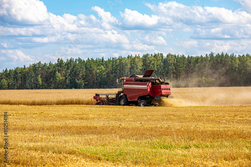 Obraz premium A red combine harvester is driving through a field of wheat