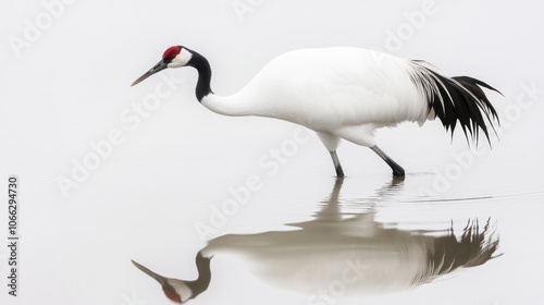 Fototapeta premium A red-crowned crane walks through shallow water, its reflection visible in...