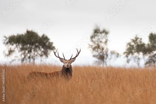 © Migara, Fototapeta premium A red deer stag walking close to Curbar Edge in the Peak District.