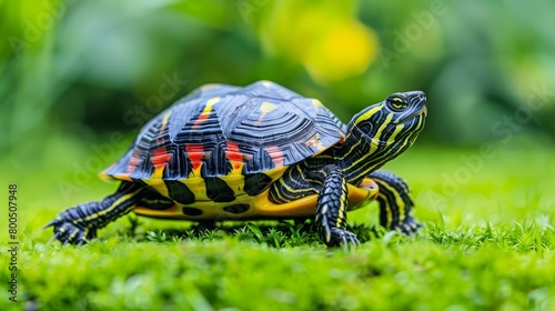 © Viktor, Obraz premium A red-eared slider turtle gazes at the camera, situated on the grass Background slightly out of focus