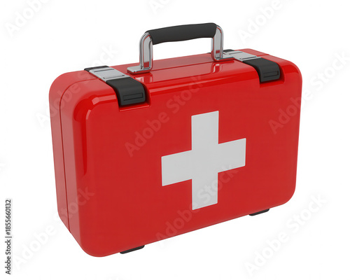 © Mdmahfuzur, Obraz premium A red first aid kit with a white cross symbol on a black background in 3 D transparent background