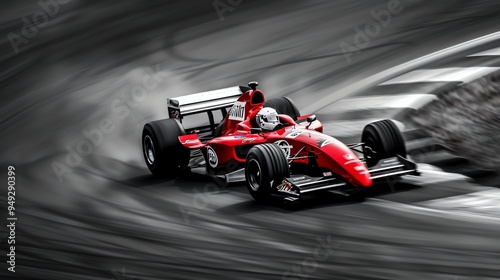© Galib, Fototapeta premium A red Formula 1 race car driving fast around a track.