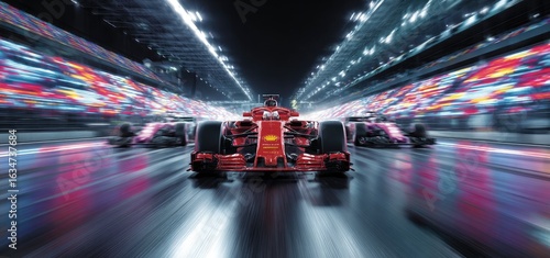 © artwiyanastudio, Fototapeta premium A red Formula 1 race car leads a pack under bright track lights at night, motion blur showcasing intense speed