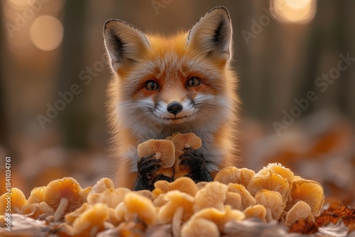 © Miramiska, Obraz premium A red fox cautiously emerges from behind a cluster of vibrant mushrooms amidst a rich carpet of fallen autumn leaves. A serene and natural scene.