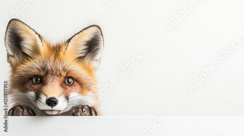 Obraz premium A red fox curiously peeks over a flat white surface, displaying its keen...