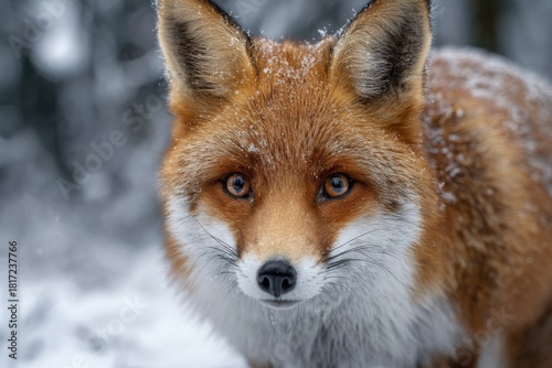© Vitalii Shkurko, Fototapeta premium A red fox is captured in a snowy landscape, its bright fur contrasts beautifully with the white snow. The fox looks directly at the viewer, showcasing its keen eyes and alert expression