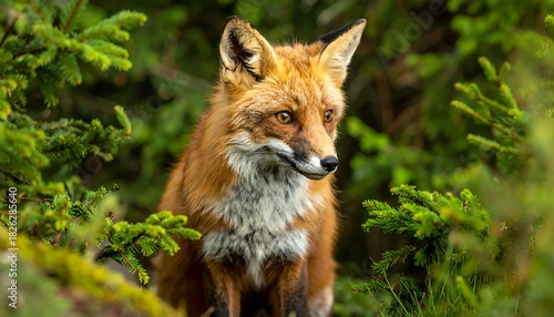 © fiber, Fototapeta premium A red fox is nestled among green pine branches, looking off to the right with bright amber eyes