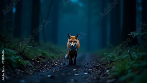 © ByyNrr, Naklejka premium A red fox moves silently along a forest path lit only by the stars, its fur glowing softly in the night air.