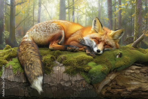 © Evita, Fototapeta premium A Red Fox Napping on a Moss-Covered Log in a Forest