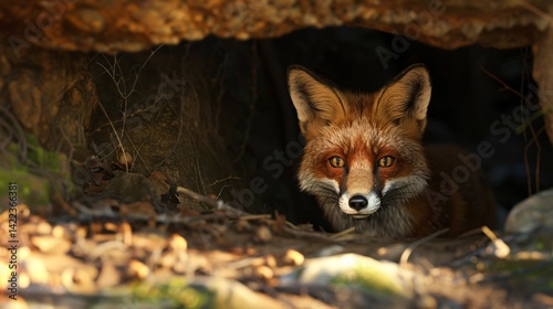 Naklejka premium A red fox peeks out from its den, its sharp eyes focused, amidst earthy tones...
