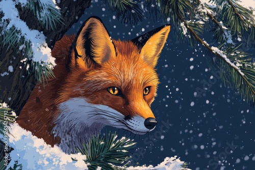 © Anjali, Obraz premium A red fox peers from behind a snow-covered pine tree in a winter wonderland.