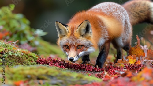 © Iswanto, Fototapeta premium A red fox prowls through a colorful forest floor, showcasing its vibrant fur and keen expression.