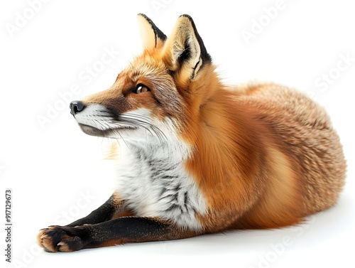 © pavlofox, Fototapeta premium A red fox relaxing on a white background during daytime