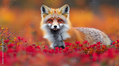 Fototapeta premium A red fox rests quietly among vibrant autumn flowers, capturing the essence...
