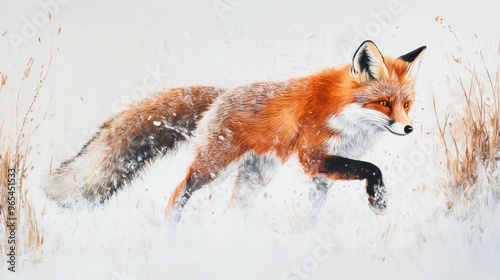 © Penatic Studio, Fototapeta premium A Red Fox Running Through Snowy Grass