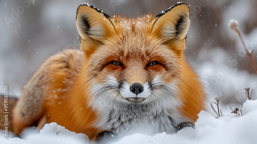 © Helois, Obraz premium A red fox sits in the snow, looking directly at the camera.