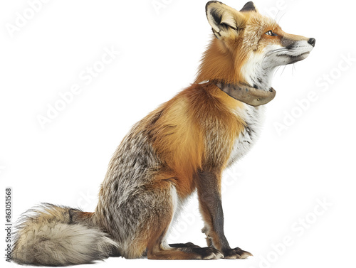 Fototapeta premium A red fox sits with its head tilted, looking up and to the side, isolated on...