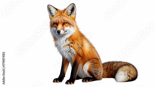 © Parvin, Naklejka premium A red fox sitting and isolated on white background, displaying its vibrant fur and alert gaze, a symbol of cunning and adaptability in nature