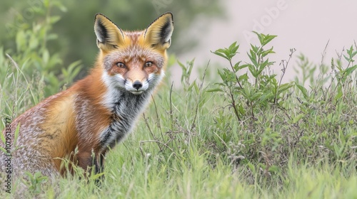 © julio, Obraz premium A red fox sitting in a grassy area, showcasing its vibrant fur.