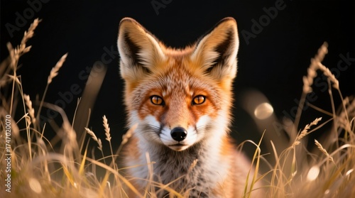 Fototapeta premium a red fox sitting in tall grass with a black background The fox has a white...