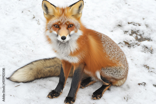© WAFIQ, Fototapeta premium A red fox sitting on snow, showcasing its vibrant fur and keen expression.