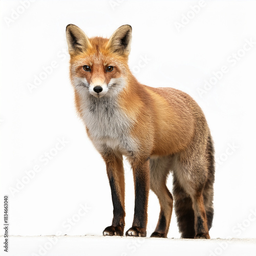 © Six Asyik, Fototapeta premium A red fox standing alert on a white background, natural lighting, full-body shot