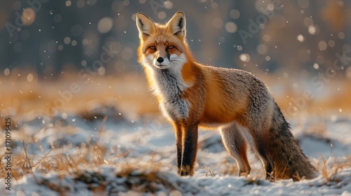 Fototapeta premium A red fox standing in a snowy landscape, with snowflakes falling and a...