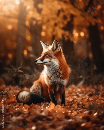 Naklejka premium A red fox standing on a bed of fallen autumn leaves, vibrant orange and yellow tones, soft sunlight filtering through the trees