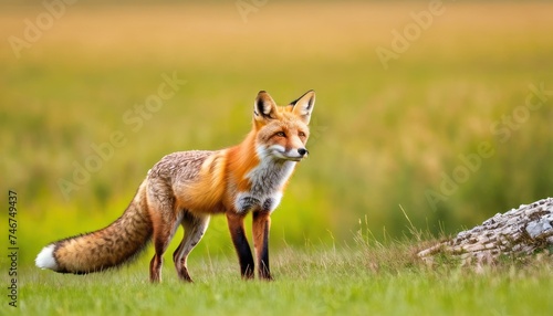 © Mikus, Fototapeta premium a red fox standing on top of a lush green field next to a pile of dirt and a fallen tree.
