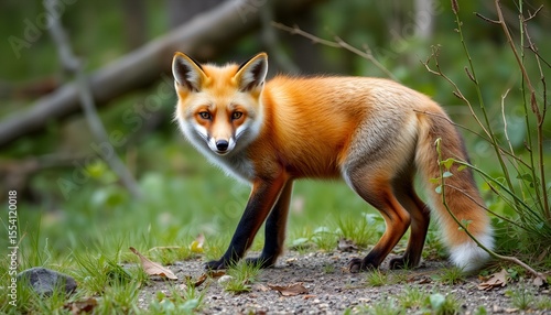Fototapeta premium A red fox stands alertly in a vibrant forest, looking directly at the viewer...