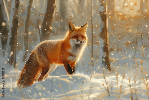 Fototapeta premium A red fox stands in a snowy forest, bathed in the warm light of the rising sun.