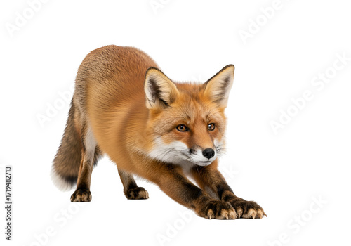 © Deidara, Fototapeta premium A red fox stretches its limbs against a stark black background, showcasing its detailed fur and alert expression.