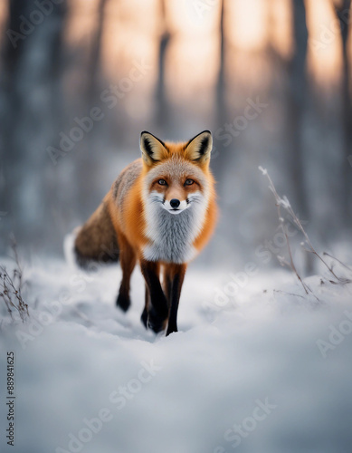 Fototapeta premium A red fox trotting through the snowy forest, twilight